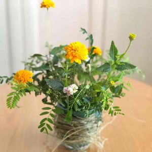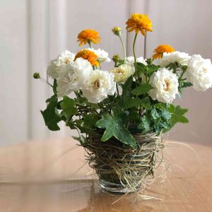 フラワーアレンジ🧡🤍💚 ベランダで咲いたミニバラ、ヘデラ、 お花屋さんで購入したヒメヒマワリで。 🏷毎日ローズショー