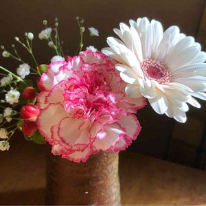 お花の少ない冬 生花をグラスにさして楽しんでいます!🎶 毎日 水替えの度に生け直して遊んでいます! ガーベラ フリージア カーネーション スターチス ユキヤナギ