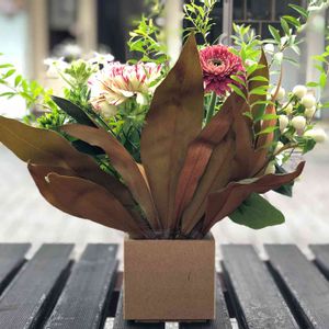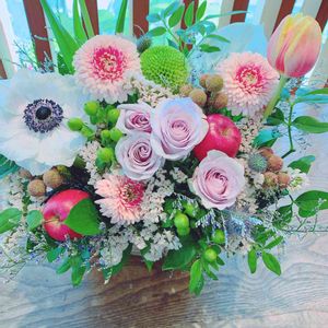 小さなアレンジがほしいってツレの奥さんに頼まれたんだけど色も花もお任せで頼まれた😅 色を統一させ過ぎたかなぁ❔