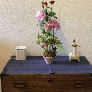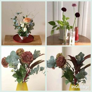 いつもの花屋さんで ユーカリ、ドラセナ、お花5本買って 玄関とリビングに置いて迎春体制に😄 左上から時計回りに ○玄関用アレンジ 細竹、ユーカリ、ミニバラ 、オレンジ色のバラはおまけでいただきました。 ○リビング角に 小輪のガーベラ3本、ライムポトス ○リビングTV横に ユーカリ、ドラセナ、アンティークカラーのトルコキキョウ →ドラセナにユーカリの枝とトルコキキョウの茎を絡ませたラフなアレンジです😅