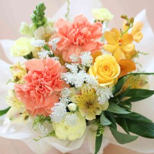 今日、作ったのが 可愛いかったので〜💐 切り花です。やっぱり、 オレンジ黄色いいですね✨ レースフラワーも可愛い♡ 使ったのは カーネーション、レースフラワー バラ、ラン、アルストロメリア 金魚草スナップ いつもありがとうございます🌱