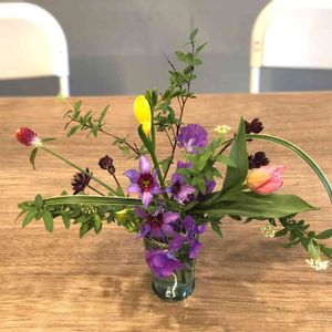 フラワーアレンジ 教室に参加しました😊 古民家を改装したアロマのお店を借りて。 アレンジは細竹6本とワイヤーで作った花留めに 花を挿していくもの。 3人3様、私のはスリムに真っ直ぐな出来上がり。