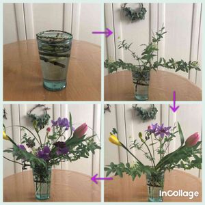 💐竹の花留めを使った、アレンジ💐 左上から ○プラスチックカップの上半分に、適当な長さに切った 寒竹をセット。 ○コデマリをあしらいアレンジの大きさを決めます。 ○茎の長いお花4種を挿します。今回はフリージア、 千日紅、リューココリネ、チューリップ。 ○低い位置にスイートピーとアストランチャマヨールを。アクセントになる細葉ミスカンサスで仕上げます。