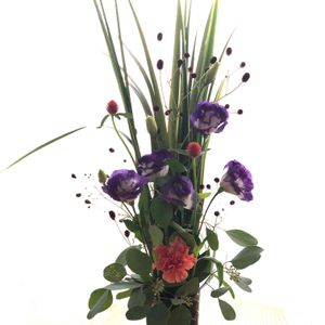 フラワーアレンジ 新潟市内で生産されたトルコキキョウをメインに、今月のテーマ「竹取物語」を復習したつもりが、別物に😅 市内の花屋さんで市内産のお花を1000円以上買うと500円値引きになるキャンペーンをやっています。