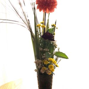フラワーアレンジ 使用した花材 左↓ ニューサイラン、フジバカマ、マリーゴールド、トルコキキョウ 右↓ 八重コスモス、モカラ、セダム、カーネーション アレンジ方法 ①ニューサイランで正面の空いた半円柱を作る。 上3分の1は細く割いておく。 ②🌕月に見立てたマリーゴールドを上の方に、 フジバカマは上中下に配し全体を繋げる。 ③マリーゴールドの下の空間をモカラをメインに埋めて、 完成。
