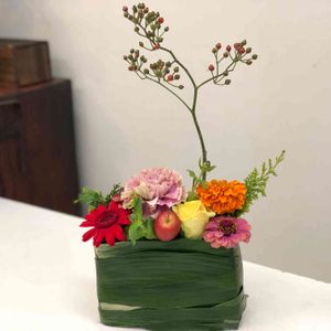 フラワーアレンジ 11月のテーマは? 「ハラン🍃で巻いた長方形の器」 最後にノバラの枝で高さを出して完成