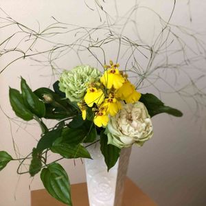 フラワーアレンジ 11月5日に切ったオンシジウムが まだもってくれています。 花材) ・わが家で咲いたオンシジウム ・リキュウソウ ・バラ ・エミューフェザー