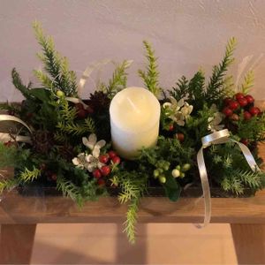 キャンドルアレンジ🕯 11月に作ったアレンジ お花が枯れたので仕立て直し 花材) ・ブルースター(白) ・さんきらい(赤) ・針葉樹(黄緑)