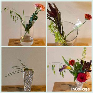 フラワーアレンジ 練習中 花が傷みやすい時期なので、2日おきに茎を切って挿し直します。 ①花材別に取り分けます ②小枝🌿でアウトライン、放射状に ③メインのお花 トルコキキョウ、バラ ④サブのお花 リンドウ、紫色の小花 ⑤スターチス