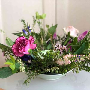 庭にある材料で 花:バラ(ジュリア)、ビオラ、オレガノ、イタリアンパセリ 葉:ローズゼラニウム、ミント、トキワマンサク 実:ヒペリカム あらためて…我が家には花が少ない😅 葉物ばかりがしげっている庭なんだなあ