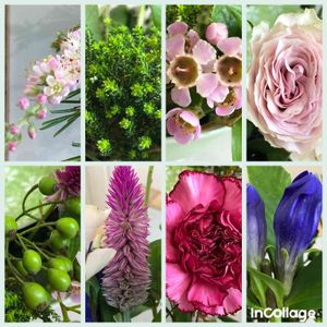 使用した花材 上段左から リョウブ、ヒバ?、ワックスフラワー、バラ 下段左から ノバラ、シャロン、カーネーション、リンドウ