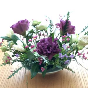 テーブルフラワー復習 トルコキキョウをメインに 白、緑、紫で
