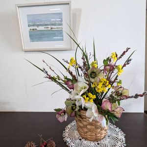 今日はクリローさんとの花遊びです ①②③クリスマスローズ 菜の花 ネコヤナギ セキショウの葉