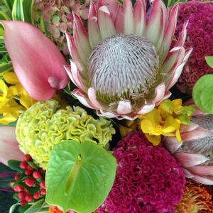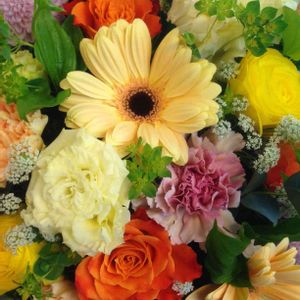 突然のお目汚しですが(^人^)💦 たま〜に通っているフラワーアレンジメントのお教室で今日作ったアレンジメントですぅぅぅ...... 床を掃除していないのがバレちゃうので、お絵描きアプリでぼかしました✨(笑) 花と花の位置が被りまくり、 ガーベラ一輪埋没しましたっ( ̄▽ ̄;)💦 唯一の成果= いつもは性格が現れるのか「こじんまり」しちゃうのが、 今日は大きく活けられた🎵(笑)