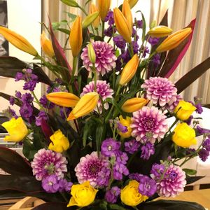 お早うございます(*☻-☻*) 出先のアレンジ💐です❣️ 💜ダリア、スプレーストック 💛薔薇、🧡スカシユリ 💚ドラセナ です。