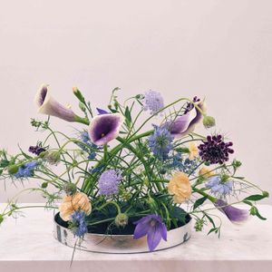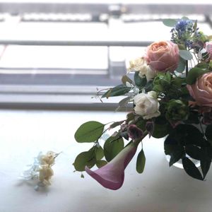 💐フラワーアレンジ💐 教室参加して来ました♪ 6月のテーマは結婚式場のテーブルに置ける花 ホリゾンタル(水平) 使用した花材/ユーカリ、カラー、バラ3種(ピンク、白、グリーン)、ガーベラ、?ブルーのお花、プリザーブドフラワー