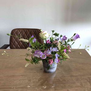 💐5月のアレンジ💐 教室参加して来ました🚶 スダレを切って花台を作って花を挿して仕上げにスダレを追加 花材)ヒメリョウブ、カンパニオラ、バラ3種、スプレーカーネーション、デルフィニウム