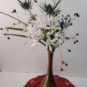 ➀鶴首の花入れへ〜꧁༺༻꧂ 鉢植えのネリネが 今年も又 咲きました🤍 ✾エリンジウム ✾ネリネサルニエンシス (別名ダイヤモンドリリー) ✾千日小坊 💕 ②の小葉のランタナは 優しい色味から冴えて 凜とした表情になりました(* ॑꒳ ॑* )