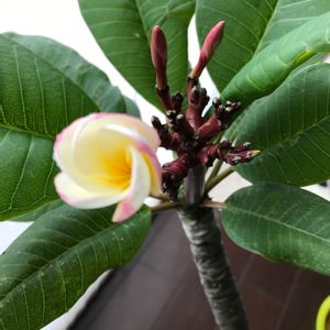 遅くにごめんなさい🙏 この前投稿したプルメリアの花🌸が ちゃんと咲きました。 だいぶ花芽が落ちてしまったので、どのくらい咲いて楽しませて貰えるのかわからないけど、とりあえず写真🤳