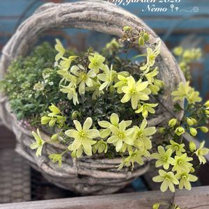 ❁⃘*.゚クレマチスピクシー 2年めのハンギング 帰宅したら… ライムグリーンの花が 1輪咲いていました・*.❁ これから 嬉しい~☺️ 開花ラッシュスタート しばらくは甘い香りに 包まれる毎日です𓂃 ❁︎