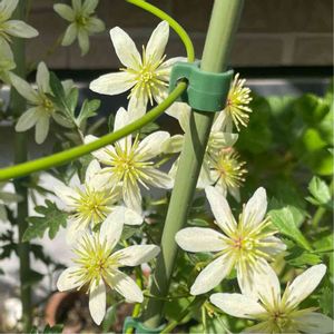 完全放置だったクレマチス。 蔓がフェンスに絡んでるのを見て、簡易トレリス(支柱)を入手し、アルミ線で誘引線を増やしてみた。