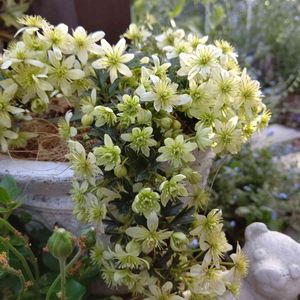 常緑 クレマチス ピクシー 小さなポット苗が、ずいぶん大きくなりました。 目下の悩みは、仕立てかた。 垂れて咲かせるのが素敵ですが、結構な重量がかかり、枝が鉢の縁に当たり傷ついてしまいます。 2年目は、当たる場所を変えるために円の支柱で支えました。 3年目もこのままいけるかな?