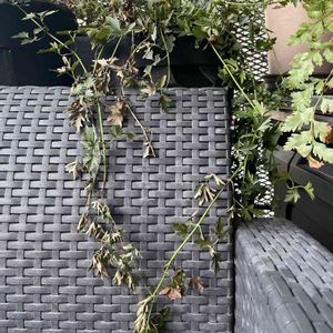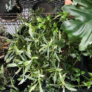 雨の朝 元気なのは嬉しいが、蔓状に伸びる植物はどう整えれば良いのやら?配置換えか?