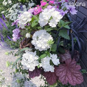 スリットバスケットに植え込んで2週間弱経ちました。 冬入りの際の特価品や庭から引っこ抜いてきたヒューケラ・コクリュウ・オレガノ・ハーブ類でボリュームを出しています。 長岡丘陵公園で見た夏のスリットバスケットを真似してみましたが蒸れずに夏を越せるかどうか…管理の方に聞いたら『適時ピンチするのがコツ』との事でしたが、適時っていつ?😅 上の花が咲くと少し華やかになると思います。 植えたお花の詳細はまた今度。 光を浴びて可愛らしかったのでupしました。
