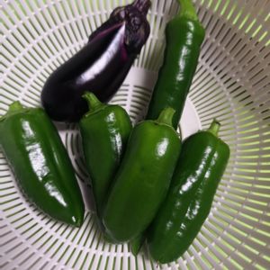 本日の収穫! ピーマン、万願寺とうがらし、葉大根。 早速夜ご飯にしましょ。