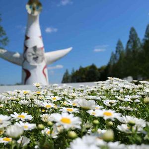 白いかわいぃーお花は ノースポール(クリサンセマム) 向うに見える太陽の塔の足元は改修工事の為フェンスがあります 中はアチコチ傷んでいるみたい〜 外観もきっとお化粧直ししてまたあの頃を彷彿とさせる姿を見せてくれるのでしょうね