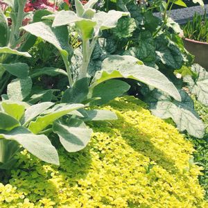 キュンキュン乙女倶楽部活動日💓 令和の新緑💚 セダム 💚 ラムズイヤー💚 ヒューケラ💚 いろんな緑💚がキラキラ✨✨✨ でも良く見るとラムズイヤーは虫食いいっぱい😅💦 殺虫剤撒いてるけど… この季節はいたちごっこだわ(⁎⁍̴̆Ɛ⁍̴̆⁎)💢