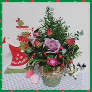 紫のバラは『シルバークラウド』だっか…💜 別のバラの蕾はギュッと開きそうにありません😅 クリスマスホーリーでプチアレンジクリスマス風🎄