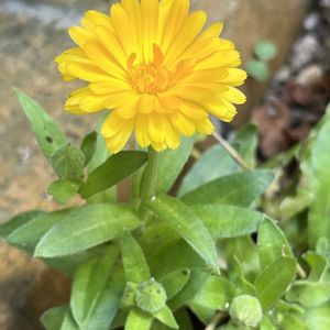 玄関の鉢植え片付けた時、 まだ葉っぱが残っていた 『ポンポン咲くキンセンカ』 かわいそうになり、地植えにしてみました。 なんと復活🌱、可愛い黄色💛 ここまま冬越しするといいなぁ。