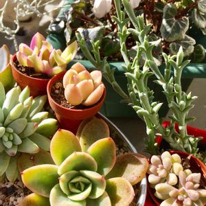 おはようございます(´∀`*) 今日も太陽出てくれるかな❁︎ セールになっていた多肉さんをまとめて寄せました ♪ 広がってたり徒長してたり、色が地味なのはご愛嬌 笑 手前の、前に作ったちびっ子ばかりの寄せ植え🌿 ウインクレリーが少し大きくなったかな? この子はベタッとする特徴があってゴミがつきやすい💦 玉葉は濃い赤が薄くなっちゃいました 今は植え替え時期でもないんだけど、見切品探してみたり 春まで待てなくてつい、ごそごそと… (๑˘ ³˘๑)•*¨*•.¸¸♪︎