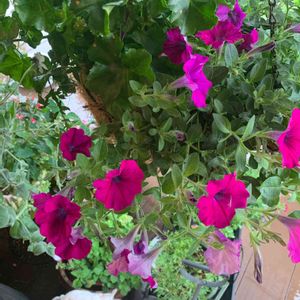 おはようございます😃 雨降り、軒下大渋滞。 イヴ🐶が通る隙間もありません😆 ペチュニア系は雨で台無しになっちゃうので、移動が一仕事。 動かない鉢にはビニール傘をさす、って花友さんがおっしゃってたので真似してます☔️