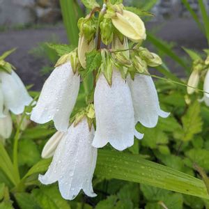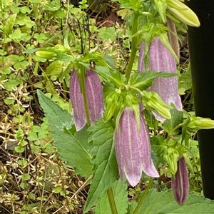 おはよう👋😃ございます ホタルブクロ 蛍袋 キキョウ科 多年草 散歩時🚶♀️より 道路脇の狭い縁石に咲いてました。釣り鐘の大小のお花が初夏の風にユラユラとパシャリ🤳するのが難しい💦😰😲