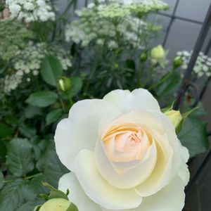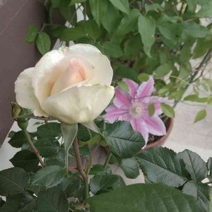 こちらは花友さんから頂いた白バラさんとクレマチスさん。 この白バラさんは花開くととってもゴージャス🌹でいい香りなんです。 頂いたので名前は不明です。