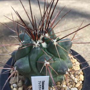 テロカクタス フレウテンベルゲリ 和名はないんですが、 鶴巣丸に似たシルエットに、 赤い花が咲くので、 「赤花鶴巣丸」 なんて呼ばれることもあります。 でも、 鶴巣より やや刺が細いかな? ひと目見てわかるように この長い刺が特徴です。 でもね、 強刺サボが好きな人は多くても、 鶴巣系はとんと人気がありません。 たぶん この四方八方に伸びる刺が、 予想以上にスペースを 取ってしまうからなんでしょうね。 水やりの際、 鉢をバケツにドボンして、 ひょいひょい元に戻してたら、 おっさんの大事な 翠冠玉の草餅ちゃんに この長い刺がブスーって刺さって、 串団子みたいになってしまいました(´°̥̥̥̥̥̥̥̥ω°̥̥̥̥̥̥̥̥`) 植え替えのときも、 この細くて長い刺は容易に革手袋を突き破ります。 もうね、危なくって仕方ありません(; ̄Д ̄) まぁ、 おっさんくらいのプロのドMになったら、 その扱い難さが むしろチャームポイントに感じたりします。 玄関脇で 刺に刺されて 指先に血の斑点を作りながらも 恍惚の笑みを浮かべながら 素手で植え替えするんです。 「いてて 今日は、随分と荒れてるぢゃん。 そんなにツンツンするなよ」 って話しかけながらね。 その姿を見た 近所の子供たちは なんか危ないものを見たという顔をして、 スッと目を逸らすようになりまして おっさん、 とても悲しいです(´༎ຶོρ༎ຶོ`)