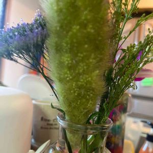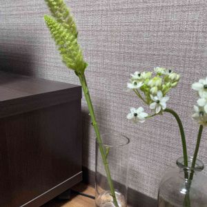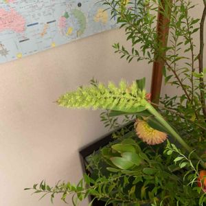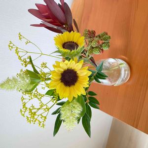 ひまわり🌻と、巨大な猫じゃらし(のようなもの) 空にして綺麗にしたワインの瓶に生けました🍾 →猫じゃらしのようなものは『アワ』と教えていただきました!ありがとうございました!