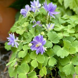 今日のお花🏷️オダマキ💜 一見オダマキに見えないですがキクザキミヤマオダマキ。葉の形や独特の種の鞘ができると仲間だと分かります。 2枚目は10日ほど前📸ヒメイズイの鉢に居座ったミヤマオダマキ💜と白い花たち。今年はミヤマオダマキが上向きに咲きました。