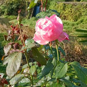 《初めての冬薔薇》④ ローズふくやま バラ園の中央に女性の像が立っています(4枚目の写真) 高橋剛の作品《翔》 この作品の近くで明るいピンク色を耀かせている薔薇 「ばらのまち」として有名な広島県福山市のシンボル的な存在となっています 毎年、春と秋(冬も)に 私たちを楽しませてくれます💞