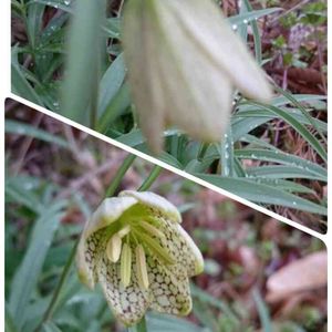 木の下でひっそりと咲いているバイモユリ! 中国原産のお花です! このお花は、うつむき加減に咲いているので、横にして撮ってみました‼