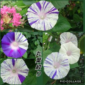 7/24(火)⑦ 朝顔 丸葉絞り 今年はまだ咲いているのを見ていません。去年の写真をコラージュし直しました😆 さっき、うとうとして知らないうちに写真をpicしてました。しかも前に一度picした八重咲きペチュニア黒真珠。ハッとしたら何も書かずに投稿していてビックリΣ(゚ロ゚;) 慌てて削除しました‼ いいね押して下さってた方々ごめんなさい!!(/o\)