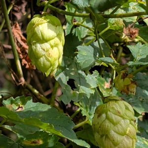 これはホップではありません。 ビールの材料になるのは、セイヨウカラハナソウ(別名ホップ)です♪♪ カラハナソウ(唐花草) アサ科 カラハナソウ属 多年草 ツル性 雌雄異株 北海道、本州(中部以北)に分布。 山地、丘陵地に生育。 茎には鉤状のトゲがある。 葉は対生、広卵形、粗く3~5浅裂~中裂し、先は尖り粗い鋸歯がある。 雄花序は倒円錐形、直立または垂れ下がる。 雌果穂は卵球形、閉じた松笠のようにみえる。 雄花も雌花も淡黄緑色。 花期9~10月 写真は雌花穂です。 雄花の写真は撮れませんでした。 茨城県 北茨城市 9月16日撮影