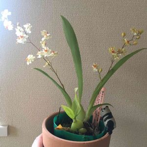 オンシジューム属 の *トゥインクル フレグランス ファンタジー * とても可愛いお花で😄 顔を近づけるとバニラの香りが~(^-^)∠※.:*:・'° 去年、お迎えした時はいっぱいお花が楽しめましたが、今年は手入れが悪かったのか? これだけ~😄・・