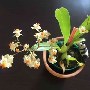 オンシジウム属 トゥインクル フレグランスファンタジー と書いてありますが長い名前ですね。 はじめての自分でお迎えした蘭です。 去年の今頃お迎えしてやっと満開に咲いてくれました。嬉しいです☺️ バニラ?チョコ?のような甘い香りがします。