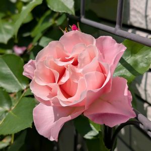 🌹ダフネ🌹 サーモンピンクの波状の花弁が華やかで存在感抜群‼️ ロサオリエンティスの「バラの家」で購入して3年目。自立シュラブとして、幹が太くなり枝も充実してきました。 嬉しいです😃🎶