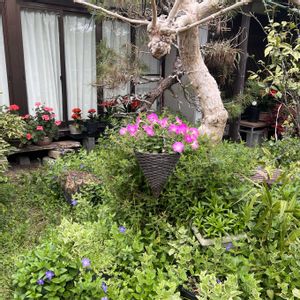 我が家の庭です。 草が茫々ですが、春めいて来ました。 ペチュニア、ツルニチニチソウ、クンシラン、ゼラニウムが咲いています。