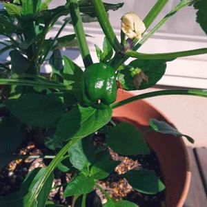 今日は、万願寺とうがらし8つ 収穫💚 ○の3つの写真は、やっと実がついたジャンボカラーピーマン赤♥️ まだ緑ですが、現時点大きいので幅6.5cm位。 触るとしっかりした肉厚の触感です🫑 カボチャの様な形のピーマンで、ハロウィンシーズンの今にピッタリ🎃 実になりたてのちっこいのも( * ֦ơωơ֦)カワエー♡