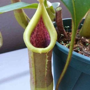 昨日フラリエでお迎えしたネペンテスの交配種 襟がグリーンでピッチャー🏺の中が赤くてブチ入りです。😍一目惚れ。 後ろにある🏺の中には大きなガがお入りになっていた😱